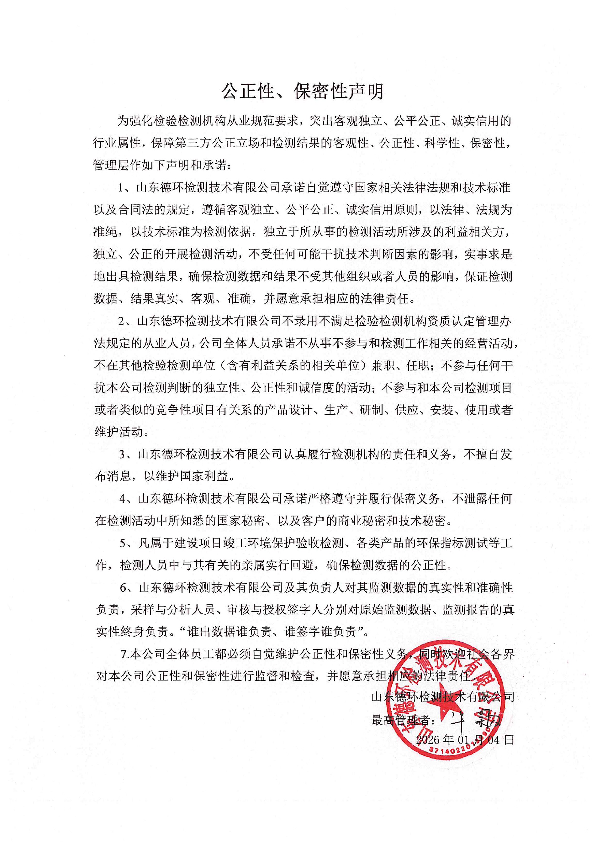 為強(qiáng)化檢驗(yàn)檢測(cè)機(jī)構(gòu)從業(yè)規(guī)范要求,突出客觀獨(dú)立、公平公正、誠(chéng)實(shí)信用的行業(yè)屬性,保障第三方公正立場(chǎng)和檢測(cè)結(jié)果的客觀性、公正性、科學(xué)性、保密性,管理層作如下聲明和承諾: 1、山東德環(huán)檢測(cè)技術(shù)有限公司承諾自覺遵守國(guó)家相關(guān)法律法規(guī)和技術(shù)標(biāo)準(zhǔn)以及合同法的規(guī)定,遵循客觀獨(dú)立、公平公正、誠(chéng)實(shí)信用原則,以法律、法規(guī)為準(zhǔn)繩,以技術(shù)標(biāo)準(zhǔn)為檢測(cè)依據(jù),獨(dú)立于所從事的檢測(cè)活動(dòng)所涉及的利益相關(guān)方,獨(dú)立、公正的開展檢測(cè)活動(dòng),不受任何可能干擾技術(shù)判斷因素的影響,實(shí)事求是地出具檢測(cè)結(jié)果,確保檢測(cè)數(shù)據(jù)和結(jié)果不受其他組織或者人員的影響,保證檢測(cè)數(shù)據(jù)、結(jié)果真實(shí)、客觀、準(zhǔn)確,并愿意承擔(dān)相應(yīng)的法律責(zé)任。 2、山東德環(huán)檢測(cè)技術(shù)有限公司不錄用不滿足檢驗(yàn)檢測(cè)機(jī)構(gòu)資質(zhì)認(rèn)定管理辦法規(guī)定的從業(yè)人員,公司全體人員承諾不從事不參與和檢測(cè)工作相關(guān)的經(jīng)營(yíng)活動(dòng),不在其他檢驗(yàn)檢測(cè)單位(含有利益關(guān)系的相關(guān)單位)兼職、任職;不參與任何干擾本公司檢測(cè)判斷的獨(dú)立性、公正性和誠(chéng)信度的活動(dòng);不參與和本公司檢測(cè)項(xiàng)目或者類似的競(jìng)爭(zhēng)性項(xiàng)目有關(guān)系的產(chǎn)品設(shè)計(jì)、生產(chǎn)、研制、供應(yīng)、安裝、使用或者維護(hù)活動(dòng)。 3、山東德環(huán)檢測(cè)技術(shù)有限公司認(rèn)真履行檢測(cè)機(jī)構(gòu)的責(zé)任和義務(wù),不擅自發(fā)布消息,以維護(hù)國(guó)家利益。 4、山東德環(huán)檢測(cè)技術(shù)有限公司承諾嚴(yán)格遵守并履行保密義務(wù),不泄露任何在檢測(cè)活動(dòng)中所知悉的國(guó)家秘密、以及客戶的商業(yè)秘密和技術(shù)秘密。 5、凡屬于建設(shè)項(xiàng)目竣工環(huán)境保護(hù)驗(yàn)收檢測(cè)、各類產(chǎn)品的環(huán)保指標(biāo)測(cè)試等工作,檢測(cè)人員中與其有關(guān)的親屬實(shí)行回避,確保檢測(cè)數(shù)據(jù)的公正性。 6、山東德環(huán)檢測(cè)技術(shù)有限公司及其負(fù)責(zé)人對(duì)其監(jiān)測(cè)數(shù)據(jù)的真實(shí)性和準(zhǔn)確性負(fù)責(zé),采樣與分析人員、審核與授權(quán)簽字人分別對(duì)原始監(jiān)測(cè)數(shù)據(jù)、監(jiān)測(cè)報(bào)告的真實(shí)性終身負(fù)責(zé)?!罢l(shuí)出數(shù)據(jù)誰(shuí)負(fù)責(zé)、誰(shuí)簽字誰(shuí)負(fù)責(zé)”。 7.本公司全體員工都必須自覺維護(hù)公正性和保密性義務(wù),同時(shí)歡迎社會(huì)各界對(duì)本公司公正性和保密性進(jìn)行監(jiān)督和檢查,并愿意承擔(dān)相應(yīng)的法律責(zé)任。 山東德環(huán)檢測(cè)技術(shù)有限公司 2026年01月04日 微信圖片_20260104090332.jpg